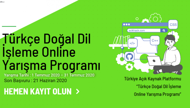 Türkiye Açık Kaynak Platformu, 22 Haziran 2020 tarihinde başlayacak ve yaklaşık 1 ay sürecek Online Türkçe Doğal Dil İşleme yarışması düzenlemektedir. Türkiye Açık Kaynak Platformu tarafından Türkçe Doğal Dil İşleme konusunda farkındalık oluşturmak amacıyla online yarışma düzenlenmektedir. İlgili yarışma süresince katılımcılardan;
