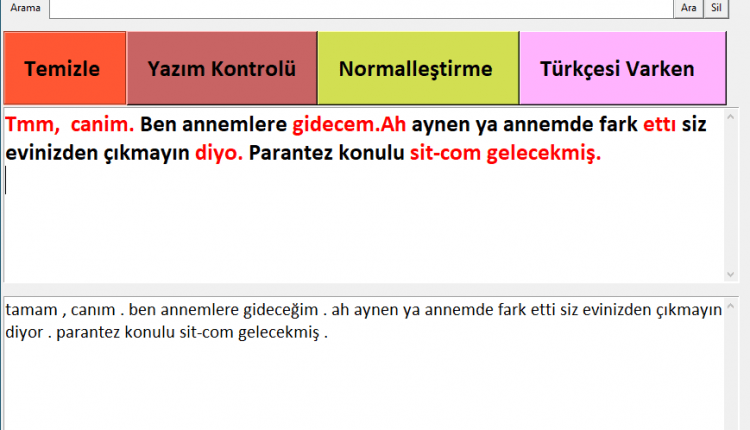 Ekran Görüntüsü 1 : Normalleştirme işleminden önce ve sonra metin.